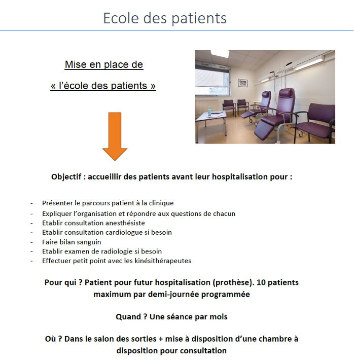 En 2020, deux nouveautés marquantes prolongent ce processus d’amélioration continue vers une dédramatisation du geste chirurgical et une amélioration du processus de récupération améliorée : la création d’une « Ecole des patients » et l’opération « Patient debout ! ».
