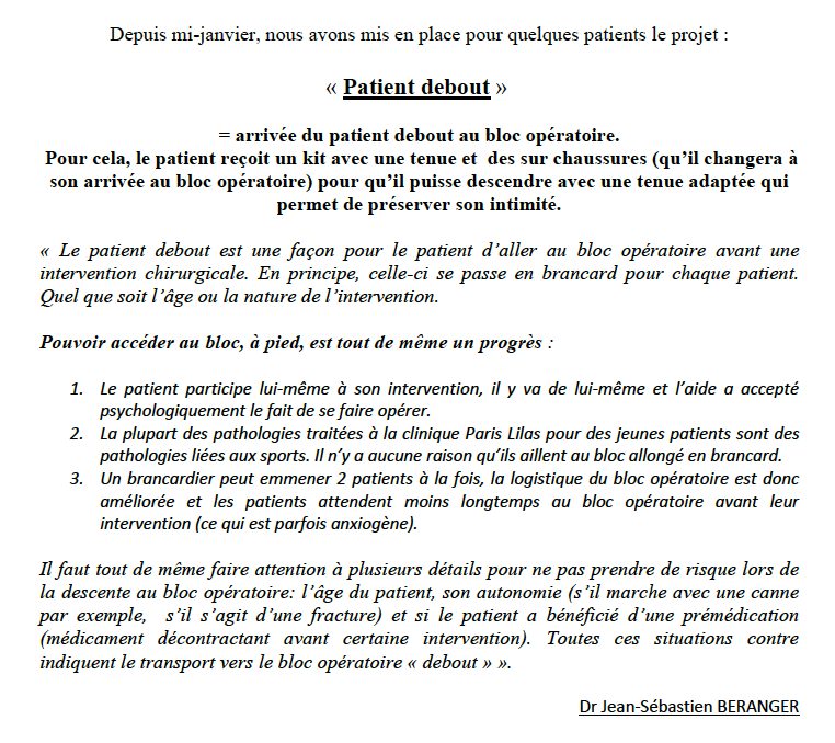 Côté patient, cela va dans le sens du respect de sa dignité et de son autonomie, côté soignants vers un circuit logique et simplifié du brancardage et de l’accès au bloc opératoire.