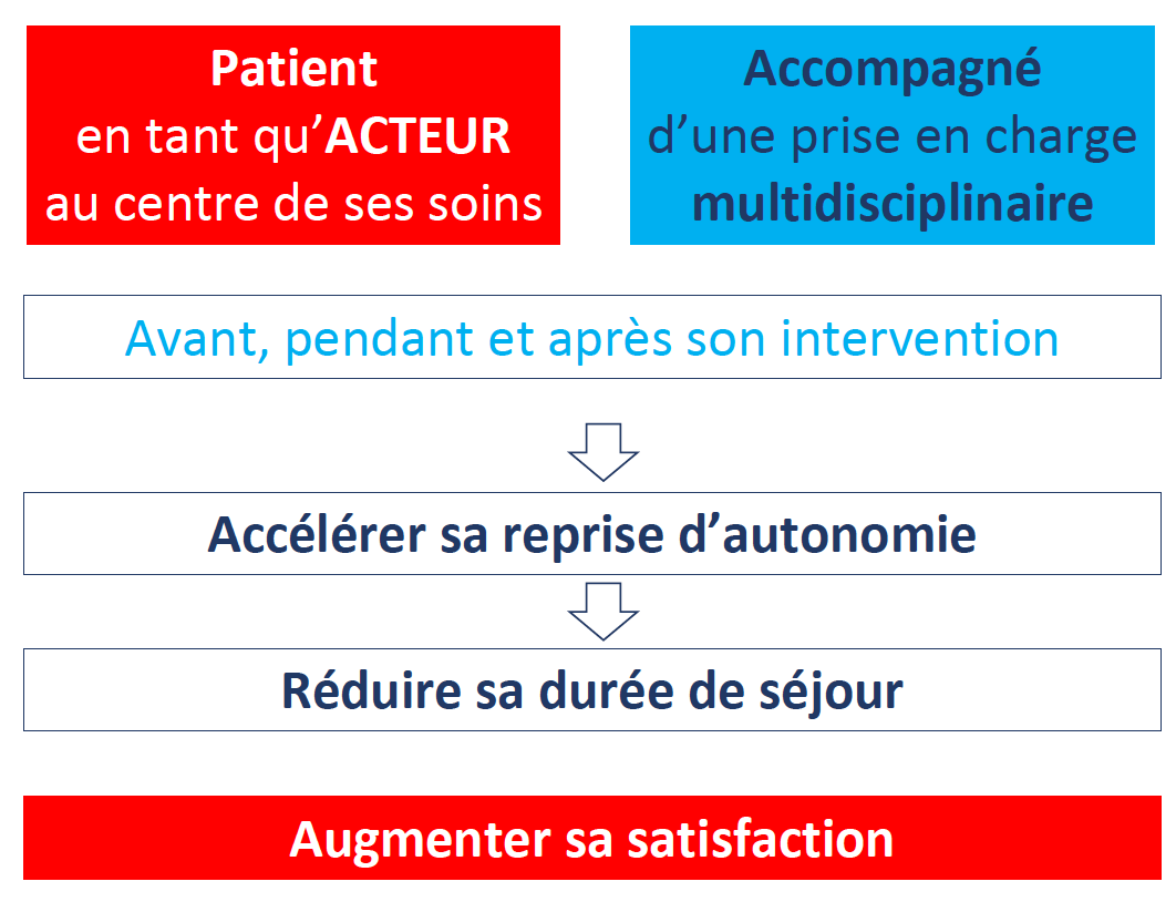 Le grand principe est d’utiliser des méthodes qui vont améliorer et accélérer la récupération des patients en centrant la démarche sur 3 acteurs principaux :