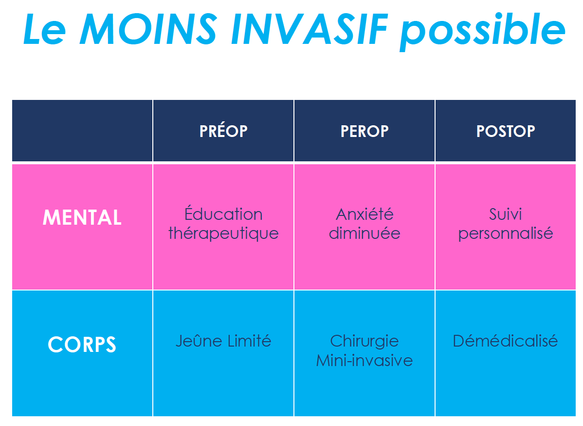 – Le chirurgien qui va employer des méthodes mini-invasives et modifier ses gestes chirurgicaux pour limiter l’agression chirurgicale,