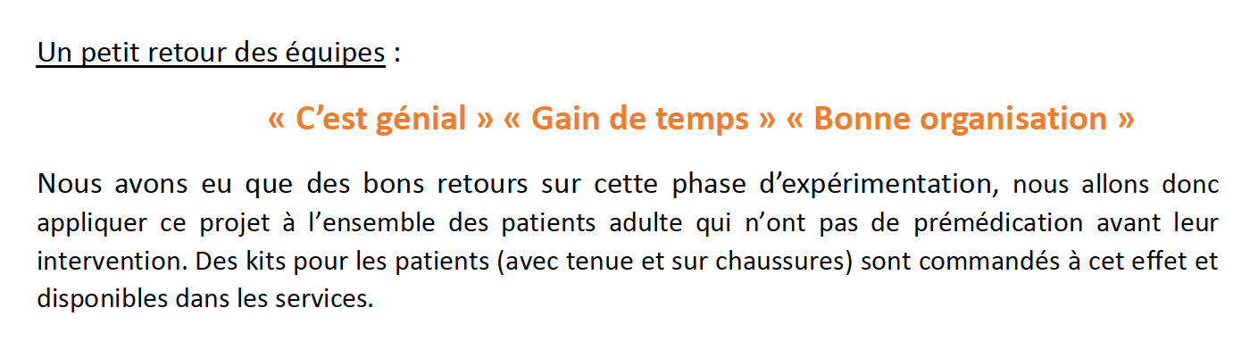 Finie l’armada des brancards avec des patients allongés et stressés, rangés les uns derrière les autres dans des couloirs au sein même du bloc opératoire ! Grâce à ce changement d’acheminement au bloc opératoire (et l’utilisation d’un kit patient dédié comportant entre-autre une tenue adaptée préservant l’intimité), le patient arrive détendu dans une salle d’attente spécifique attenante à la salle d’intervention avant qu’un soignant vienne le chercher pour enclencher les procédures d’anesthésie et de chirurgie.