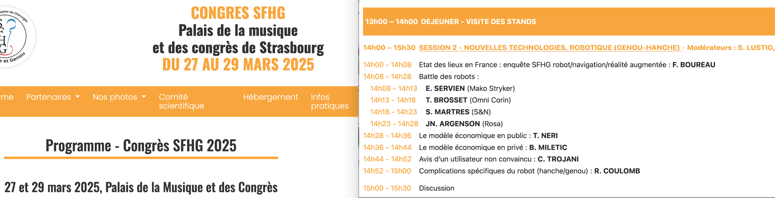 -les prothèses de hanche ont progressé depuis 20 ans (implants, planification systématique, méthodes de pose par voie antérieure mini-invasive) : elles ne se luxent plus et ne s’usent pas. Pour le genou, la situation est moins idyllique à moyen et long terme : plus de gêne résiduelle (dans les escaliers), de raideur, d’usure, de descellement, de reprise chirurgicale à mettre sur le compte des composants de la prothèse (qui reproduisent un genou imparfait) et surtout de la méthode de pose (alignement/axe, équilibrage ligamentaire lors de la flexion/extension, trajet de la rotule) : c’est dans ce contexte qu’une assistance informatique et robotique est pertinente !
