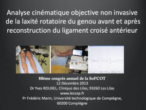 Ces premiers résultats ont été présentés à la SofCOT 2013 (Première Française !), démontrant que l’analyse cinématique légère était faisable en pratique clinique mais imposait de nouvelles contraintes que ce soit dans le recueil du signal, son traitement ou sa restitution de façon conviviale pour nous orthopédistes.