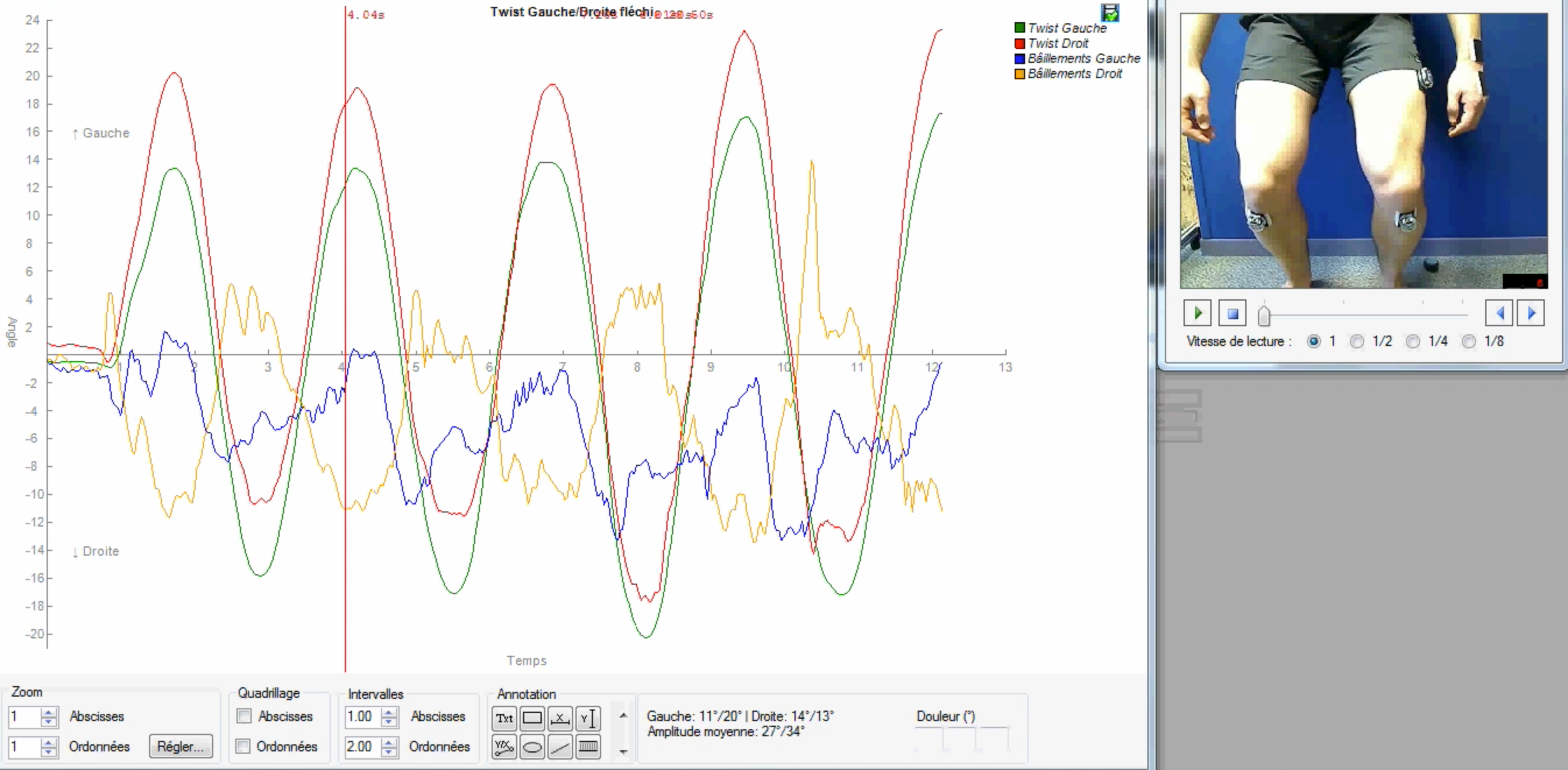 Durant 2 ans, les genoux blessés ont été enregistrés en consultation et au bloc opératoire (avant et après la reconstruction du ligament croisé antérieur) grâce un protocole précis mesurant le ressaut rotatoire (induit par l’absence du ligament) en utilisant des capteurs Bluetooth. Ensuite, un logiciel a été élaboré permettant le traitement du signal recueilli afin d’obtenir une donnée cinématique la plus pertinente : la vitesse angulaire en fonction de l’angle de flexion du genou (elle augmente soudainement vers 30° lorsque le ressaut apparait).