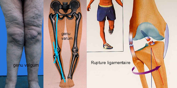 Elle est souvent spectaculaire dans le plan frontal : genu varum (attitude Lucky luke) ou genu valgum (attitude Bécassine) parfois impressionnant. En fait, elle est surtout invalidante dans le plan sagittal (raideur en flexion ou flessum).