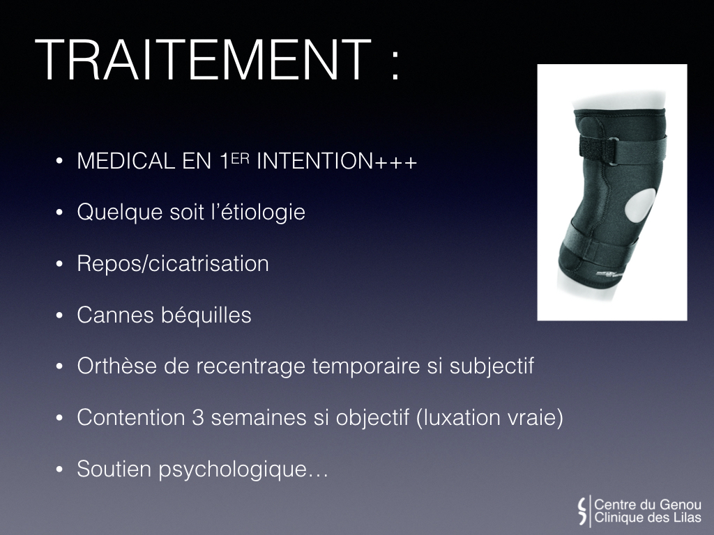 A la période aigue, le genou est rempli de sang avec une douleur externe (la rotule a cogné sur le fémur) et une douleur interne (déchirure de l’aileron rotulien). Le traitement consiste en une immobilisation de quelques semaines suivie d’une rééducation assez longue.