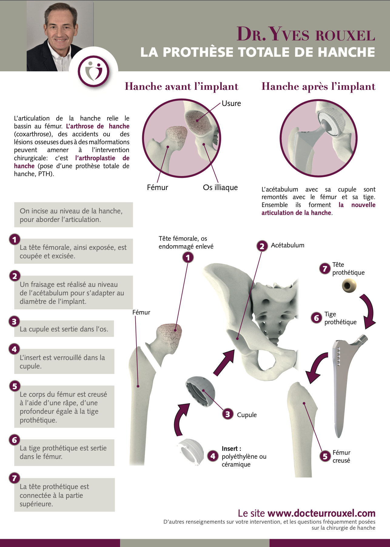 Enfin, cette intervention peut être réalisée de façon mini-invasive grâce aux instrumentations chirurgicales modernes et aux progrès des techniques d’implantation. Elle peut aussi être menée sous le contrôle d’un ordinateur (on parle alors de chirurgie “naviguée” par ordinateur). Le bénéfice à long terme de ces nouvelles techniques de pose n’est toutefois pas encore clairement établi même si elles suscitent à l’heure actuelle un enthousiasme certain. En tout état de cause, la triade bon examen clinique- bonne indication de prothèse- bonne implantation de celle-ci reste en matière de prothèse de hanche le garant du meilleur résultat fonctionnel.
