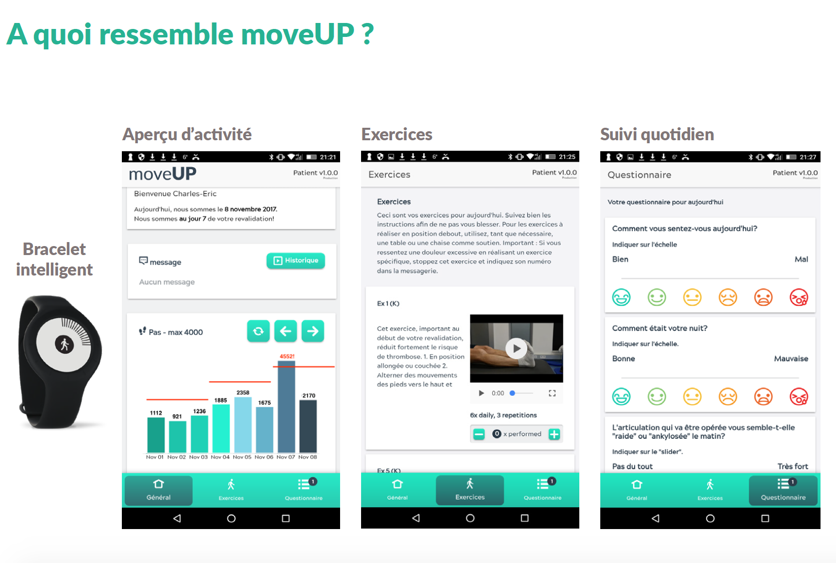 - L’arrivée de la E-médecine avec le suivi connecté du patient lors de la récupération après chirurgie (prothèses, reconstruction du ligament croisé antérieur), qui permet à l’opéré d’être acteur de sa rééducation, suivi à distance par une plateforme web, en contact avec infirmières, kinésithérapeutes et médecins rééducateurs. Ceci permet au patient de se situer par rapport à une évolution « standard », de savoir s’il en fait trop ou pas assez, de calmer ses inquiétudes éventuelles et de mesurer son niveau de satisfaction. 2019 voit chez nous l’introduction de la solution move up, testée en Belgique depuis 2 ans, comprenant tablette tactile, logiciel dédié et montre connectée