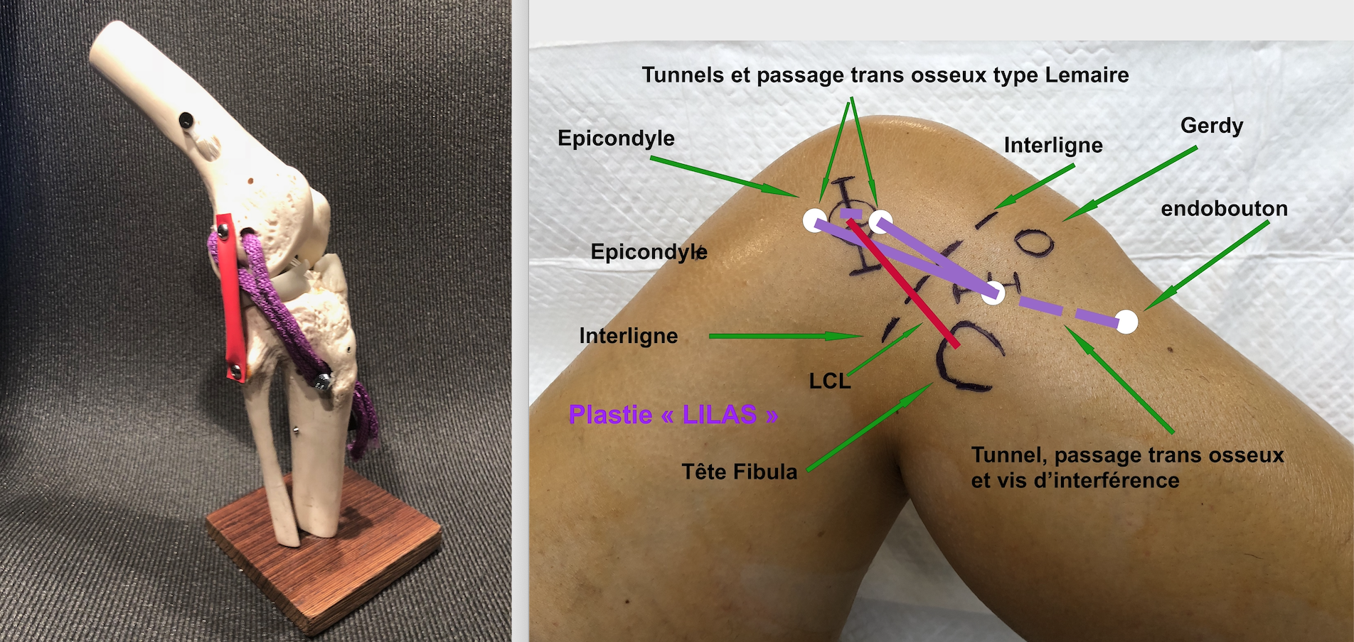 Divers montages ont été proposés depuis une dizaine d’années en associant la reconstruction intra articulaire du ligament croisé antérieur avec des comportements biomécaniques malheureusement différents. Durant son trajet, cette plastie doit cheminer au mieux sous le ligament latéral externe afin d’éviter des variations excessives de longueur et de reproduire un effet poulie. Partant de ces principes, notre équipe a mis au point une plastie inédite dénommée « Plastie Lilas » répondant au mieux aux divers prérequis trouvés dans la littérature.